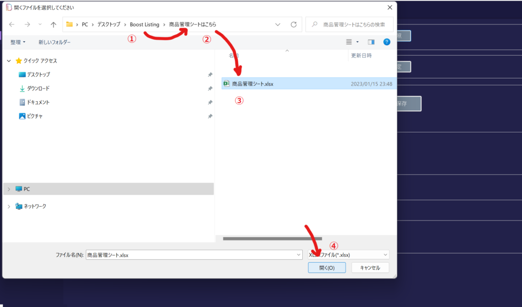 2.保存したツールフォルダから商品管理シートのエクセルを選び、開くをクリックしましょう。