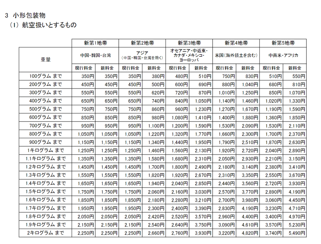 国際郵便の料金は重量・国別なのでこちらから計算できます。