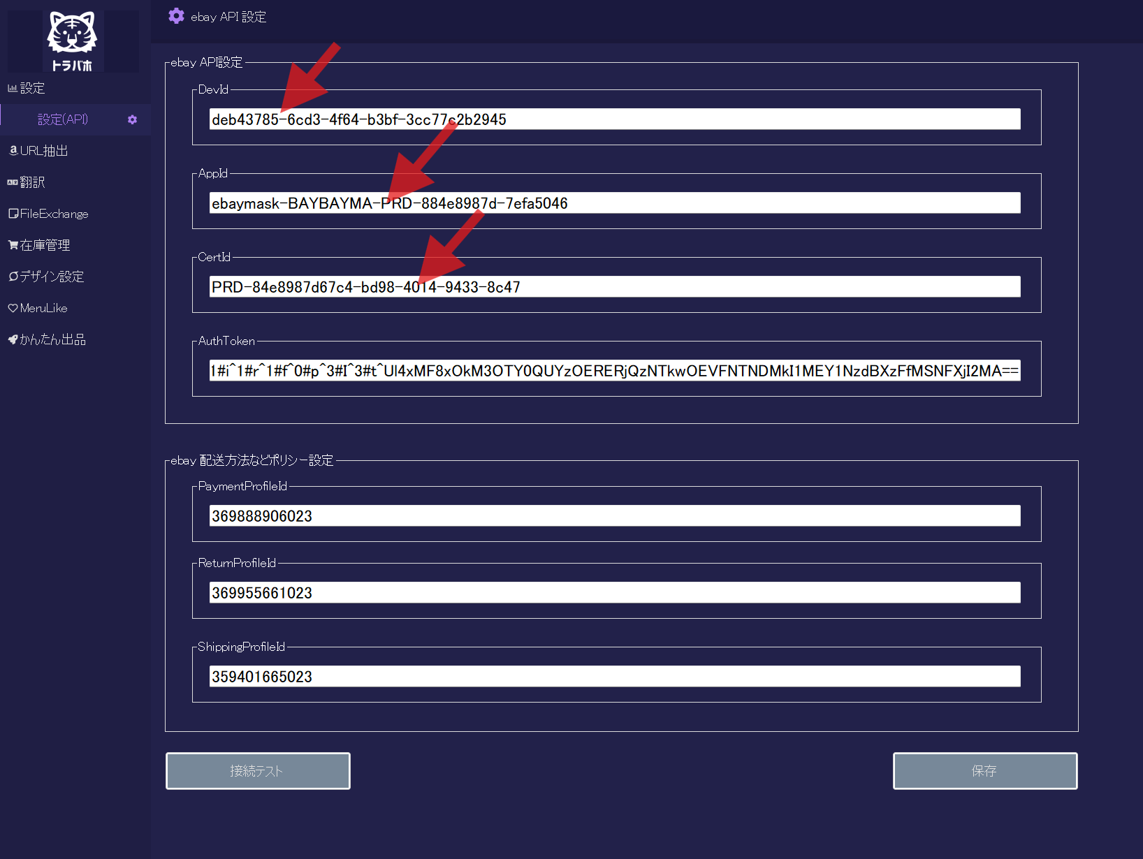 ③それぞれPaymentProfield(支払いポリシー)、ReturnProfield(返品ポリシー)、ShippingProfield(発送ポリシー)へ入力する